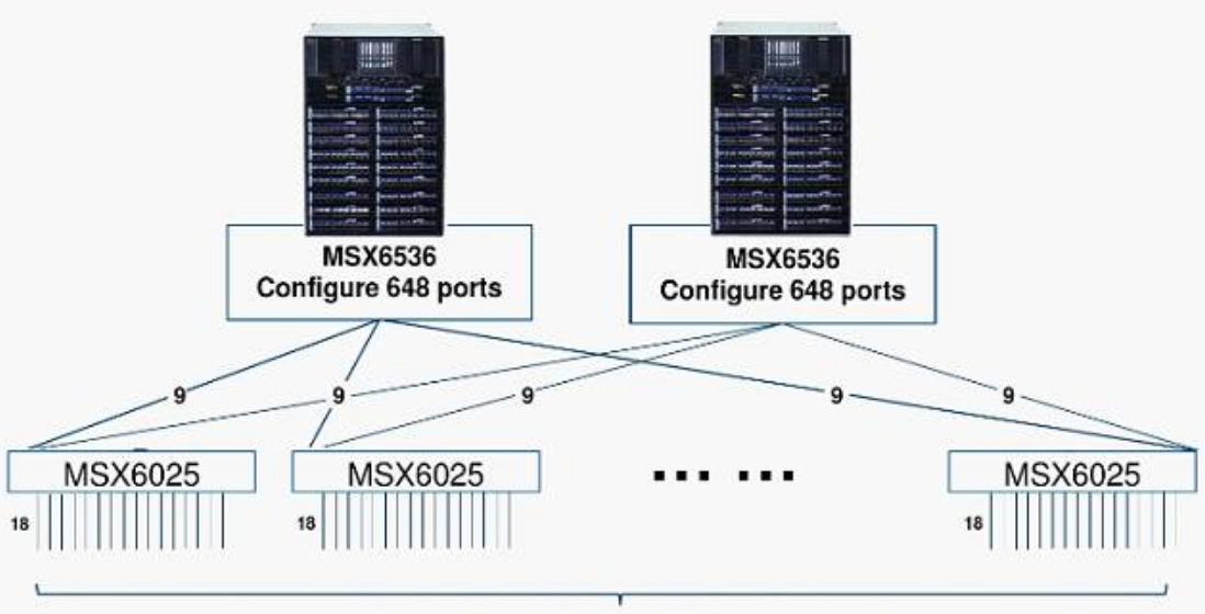 上图是一个采用二层架构的无阻塞Fat Tree组网事例,接入层下行提供1296个IB端口给服务器或存储适配卡,上行也提供适配器给汇聚层。但从一个接入IB交换机来看,上行和下行分别提供18个接口实现无阻塞组网。胖树拓扑结构一方面提供费阻塞数据传输,另一方面提供网络冗余增强网络可靠性。