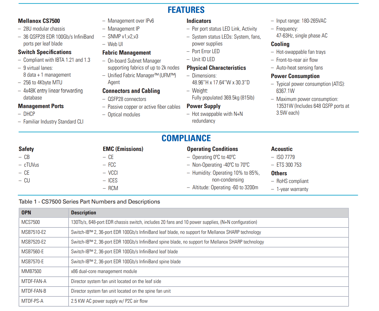 CS7500 采用 NVIDIA 最新的交换机 IB InfiniBand 交换机设备,每个端口提供高达 648 100Gb/s 的全双向带宽。CS7500 模块化底盘开关为中型和特大尺寸集群提供了出色的性价比,以及董事级交换机的可靠性和可管理性。