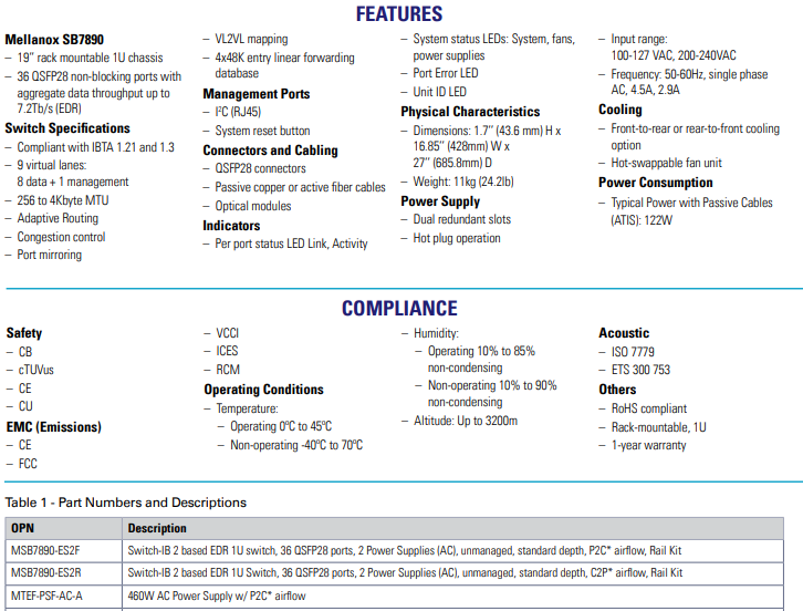 • 36 x EDR 100Gb/s 端口在 1U 开关中