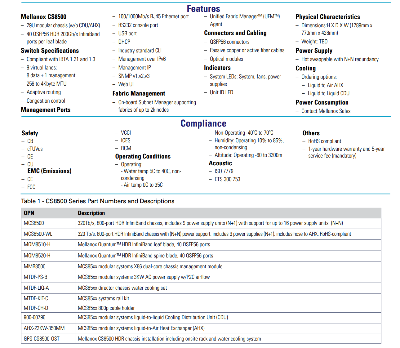 CS8500 采用量子 InfiniBand 开关设备制造,每个端口提供高达 800 200Gb/s 的全双向带宽。CS8500 模块化底盘开关为中型和特大尺寸集群提供了出色的性价比,以及模块化级开关所期望的可靠性和可管理性。