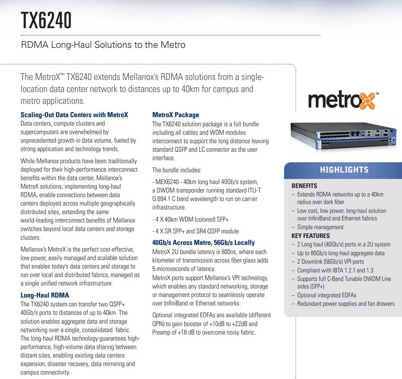 MetroX TX6240 将 RDMA 解决方案从单一位置数据中心网络扩展到校园和地铁应用的 40 公里距离。