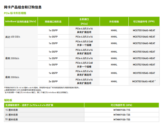 ConnectX-7 的智能网络计算加速引擎包括集合加速、MPI Tag Matching 和 MPI_Alltoall 引擎。这些性能优势以及前后向兼容性的标准保证,能够确保计算和数据密集型应用 程序的出色性能和可扩展性,帮助用户保护其数据中心投资。 产品组合 > 单端口或双端口,每端口 400Gb/s 或 200Gb/s,端口采用 OSFP 连接器 > 双端口 200Gb/s,采用 QSFP 连接器 > PCIe 标卡半高半长(HHHL)外形规格,具有 NVIDIA Socket Direct™ 选项 > 开放计算项目 3.0 (OCP3.0)全高小卡(TSFF)和小卡(SFF) > 独立 ConnectX-7 专用集成电路(ASIC),支持 PCIe 交换机功能。